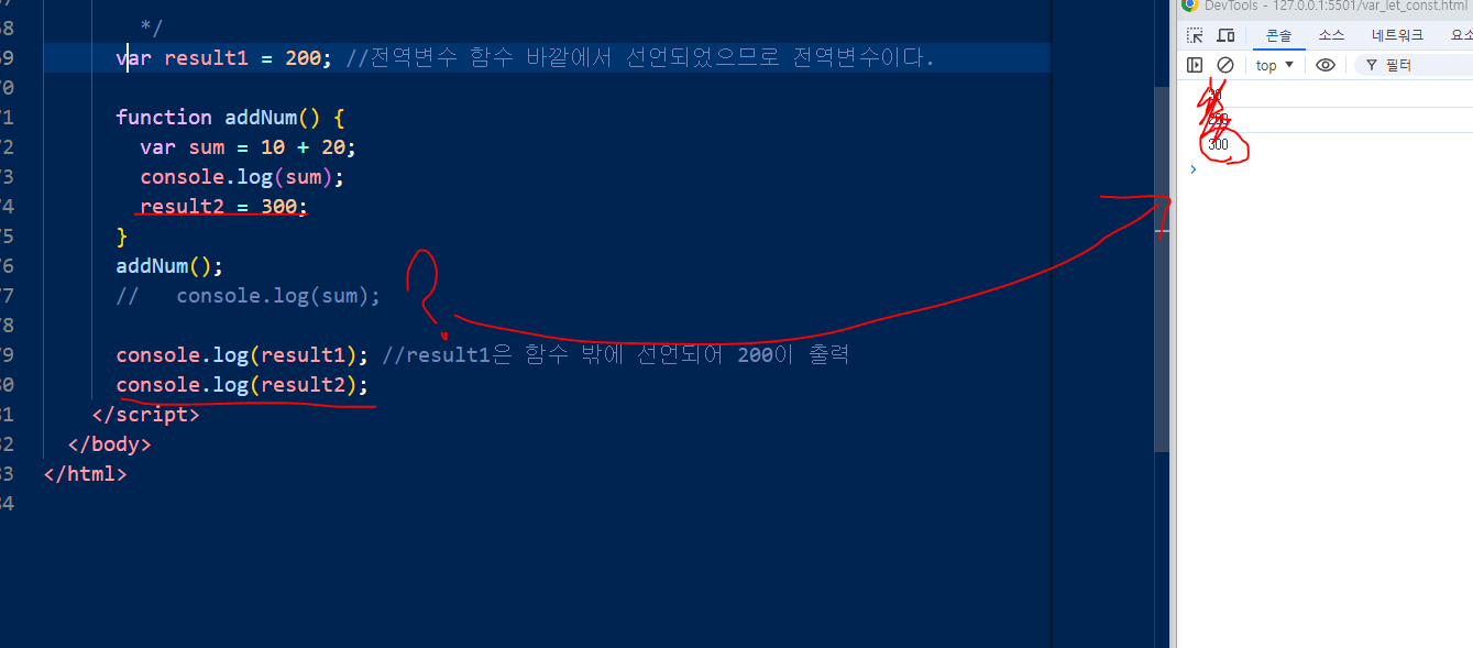 변수를 전역으로 사용할때에는 함수 밖에서 선언하거나, var 예약어를 생략하고