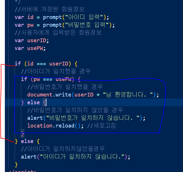 - (0 null undefined 빈칸) => 모두 다 false , if의 중괄호에