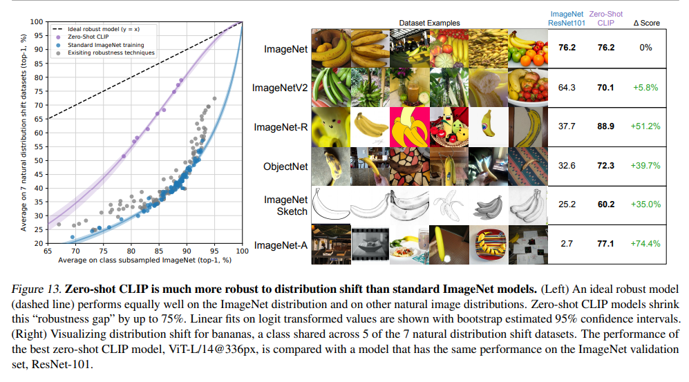 위 표는 zero-shot CLIP와 Linear Probe on Resnet50(Linear Probe는 linear classifier만 supervised learning 을 진행한 것을 말합니다.)을 비교한 결과입니다. 16개의 데이터셋에서 CLIP이 앞섰는데, 전혀 학습이 되지 않은 상태에서 이 결과는 놀랍습니다.