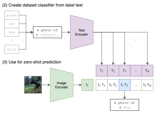 우선 학습할 때 사용된 데이터와 유사도를 높이기 위해 각 레이블에 prompt engineering을 진행하여, 그저 plane이라고만 하지 않고 A photo of plane과 같이 문장형으로 서술합니다. 서술된 레이블을 text encoder에 넣은 다음, 예측하고자 하는 이미지를 이미지 encoder에 넣어 예측을 진행합니다.