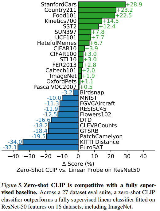 CLIP보다 resnet50이 앞선 부분은 대부분 전문적이거나 세부적인 판독을 요하는 데이터셋이었습니다. 이는 CLIP의 한계도 나타내는데, 다양한 범주의 웹 데이터로 학습된 만큼 대중적인 요소들은 잘 판별 가능하나 세부적이고 전문적이게 들어가면 성능이 하락한다는 것입니다.