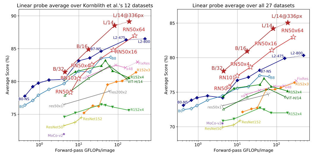 다만, 이렇게 zero-shot prediction은 CLIP에서만 존재하기 때문에 다른 CV 모델들과 명확한 비교가 안될 수도 있습니다. 정말 CLIP이 특징을 잘 추출하는지 확인하기 위해, CLIP에 linear prob를 추가해 동일한 조건으로 다른 모델들과 비교를 하였습니다. 위 표는 다양한 데이터셋에 대해, 다양한 모델들의 성능을 비교한 결과입니다. CLIP(ViT)와 CLIP(Resnet50)이 좋은 성능을 보이는 것을 확인할 수 있습니다.