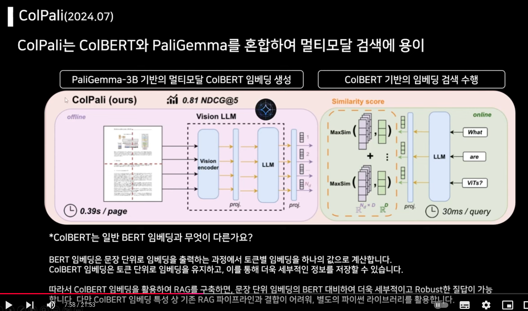 정리하자면 우선 PaliGemma를 이용하여 pdf로 이미지를 이해하고, 벡터 저장소에 넣고, 질문이 들어오면 ColBERT를 이용하여 토큰별로 유사도를 구한다.