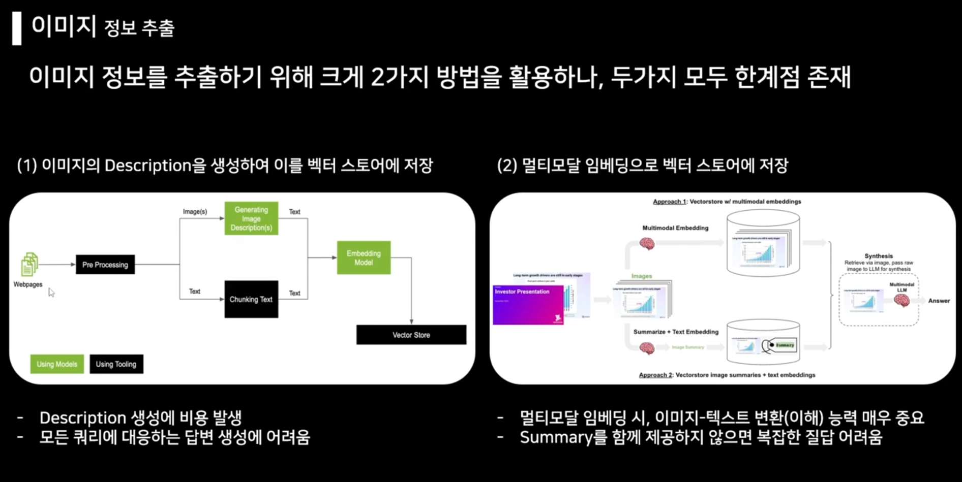 1번은 이미지 인식이 가능한 멀티모달을 활용하여 설명을 생성하는 방법인데, 기존에 이미지를 받아들일 수 없는 기존에 비해서는 더 많은 정보를 받아들이게 된다. 그러나 단점은 위 이미지에 쓰여져 있는 것과 같다. 양이 많을 수록 모델 호출비용이 많이 들고, 이미지에 대한 설명을 모두 맡기므로 조금 불완전하게 설명이 생성된다 하면은, 사용자가 얼마나 자세하게 물어봐도 설명은 모델이 생성한게 전부이니 한계가 있다.