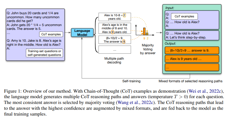 방법은 굉장히 간단하다. 위에 그려져 있는 그래프가 방법론의 전부인데, 우선 CoT를 통해 다양한 답변들을 생성해내고 self-consistency(Majority Voting)을 통해 레이블을 만들어낸다.
