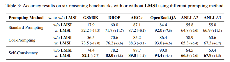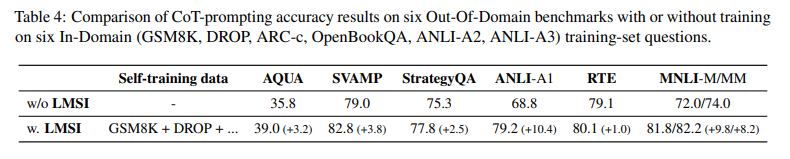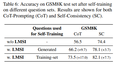 또한, LMSI를 적용한 단일 경로 CoT-Prompting의 성능은 LMSI가 적용되지 않은 모델의 Self-Consistency 보다 더 뛰어납니다. 이는 LMSI가 여러 추론 경로로부터 학습하는 데 도움이 된다는 것을 보여줍니다.
