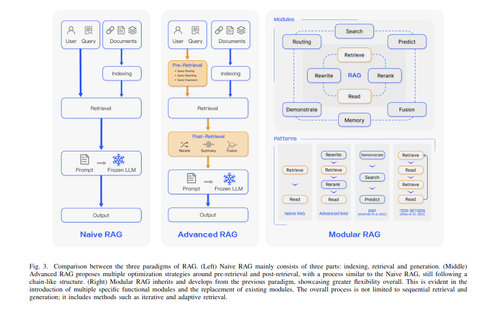 고정된 구조의 Naive RAG 또는 Advanced RAG와 달리, Modular RAG는 모듈 교체 및 재구성을 허용한다. 이는 시스템의 다양한 구성 요소(Retriever, Generator, Search Module 등)을 독립적으로 교체, 최적화 할 수 있다는 것이다.