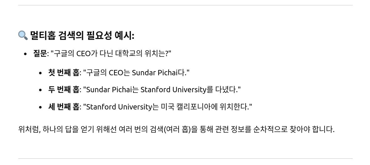 위는 챗지피티가 만든 멀티홉의 예시... 지금 생각해보니 위의 예시는 쿼리 확장에 좀 더 가깝겠다.
