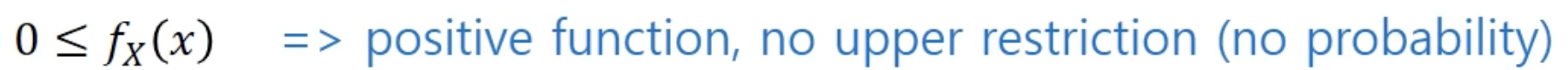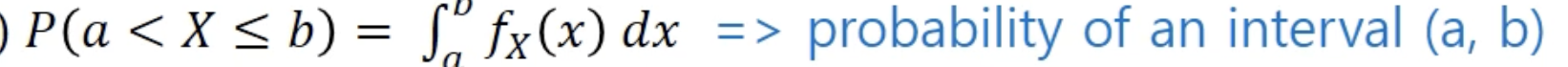 - 특정한 하나의 값에 대해 확률이 아니라,구간을 기반으로(밀도) 나타냄