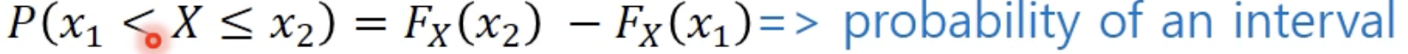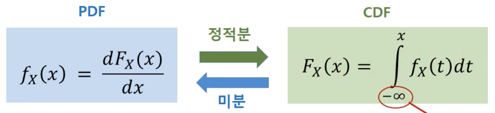 - CDF를 이용하여 연속확률변수의 확률분포 = 확률밀도함수를 나타냄