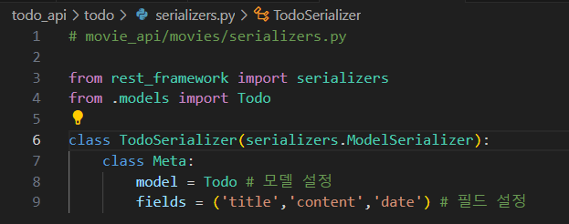 queryset과 모델 인스턴스와 같은 복잡한 데이터를 json,xml 또는 다른 콘텐츠 유형으로 쉽게 변환할 수 있습니다. 받은 데이터의 유효성을 검사한 다음, 복잡한 타입으로 형 변환할 수 있도록 serializeation을 제공합니다.