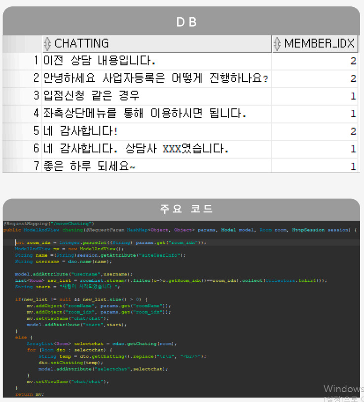 session에 담겨있는 유저에 정보를 통해 채팅룸을 생성합니다. member_idx로 관리자와 고객을 구분하고