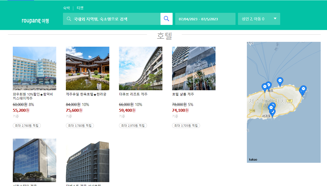 메인과 마찬가지로 검색기능 추가로 입력된 날짜와 인원수 그리고 지역 선택을 통해 조건에 맞는 상품(호텔)을 출력합니다.