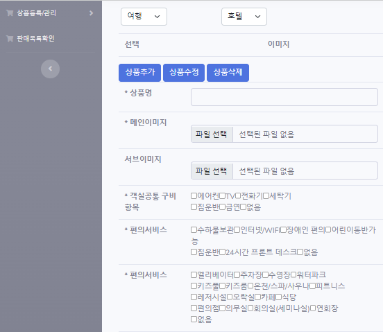 상품등록은 티켓,상품,여행상품등을 value를 통해 구분하고 bot_title에 팬션, 호텔을 통해