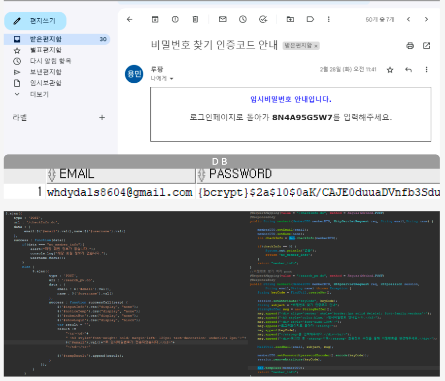 ajax를 통하여 아이디가 유효한가를 먼저 판단하고 유효하다면 다시한번 컨트롤러에 진입하여 이메일로 임시비밀번호(랜덤한 문자+숫자)를 전송하고 전송된 임시비밀번호를 DB에 암호화된 형태로 저장되도록 구현했습니다.