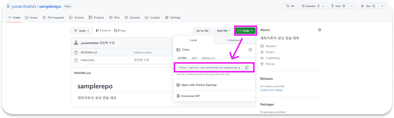 레파지토리 주소는 Code버튼을 클릭하여 확인 할 수 있다.