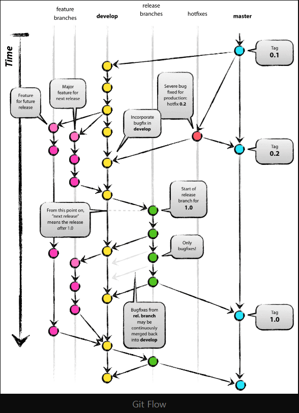 VCS (Version Control Systems)Git Flow는 Vincent Driessen이 그의 블로그에 2010년에 올린 A successful Git branching model 이라는 글이 인기를 끌며 대중적으로 사용되게 된 브랜치 전략이다.