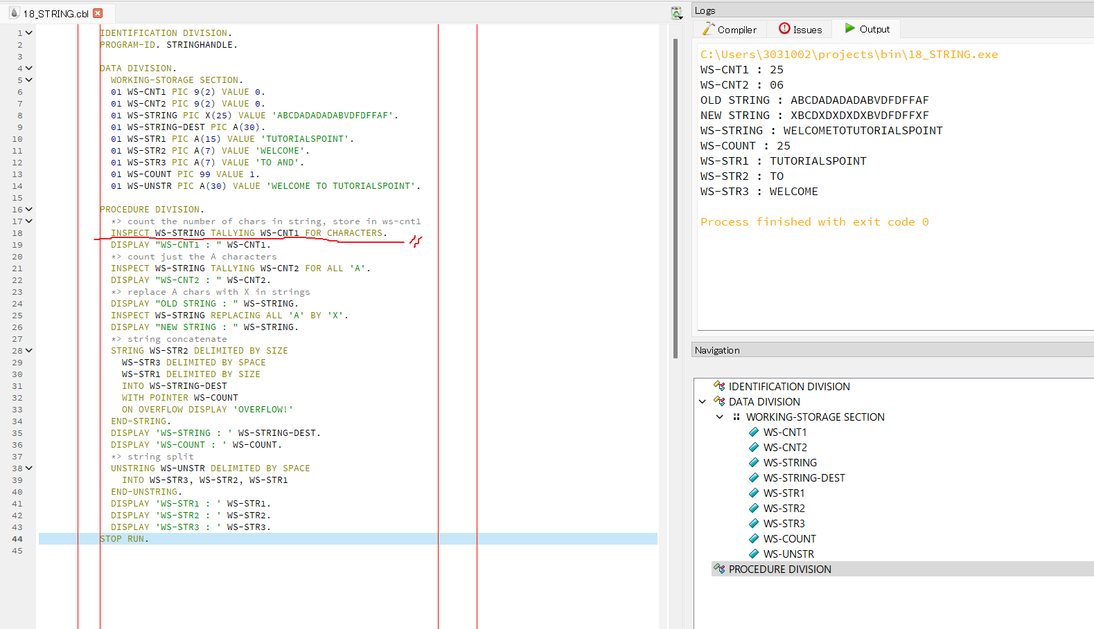 INSPECT WS-STRING TALLYING WS-CNT1 FOR CHARACTERS는 COBOL 프로그램에서 문자열 내의 문자 수를 세는 작업을 수행합니다.