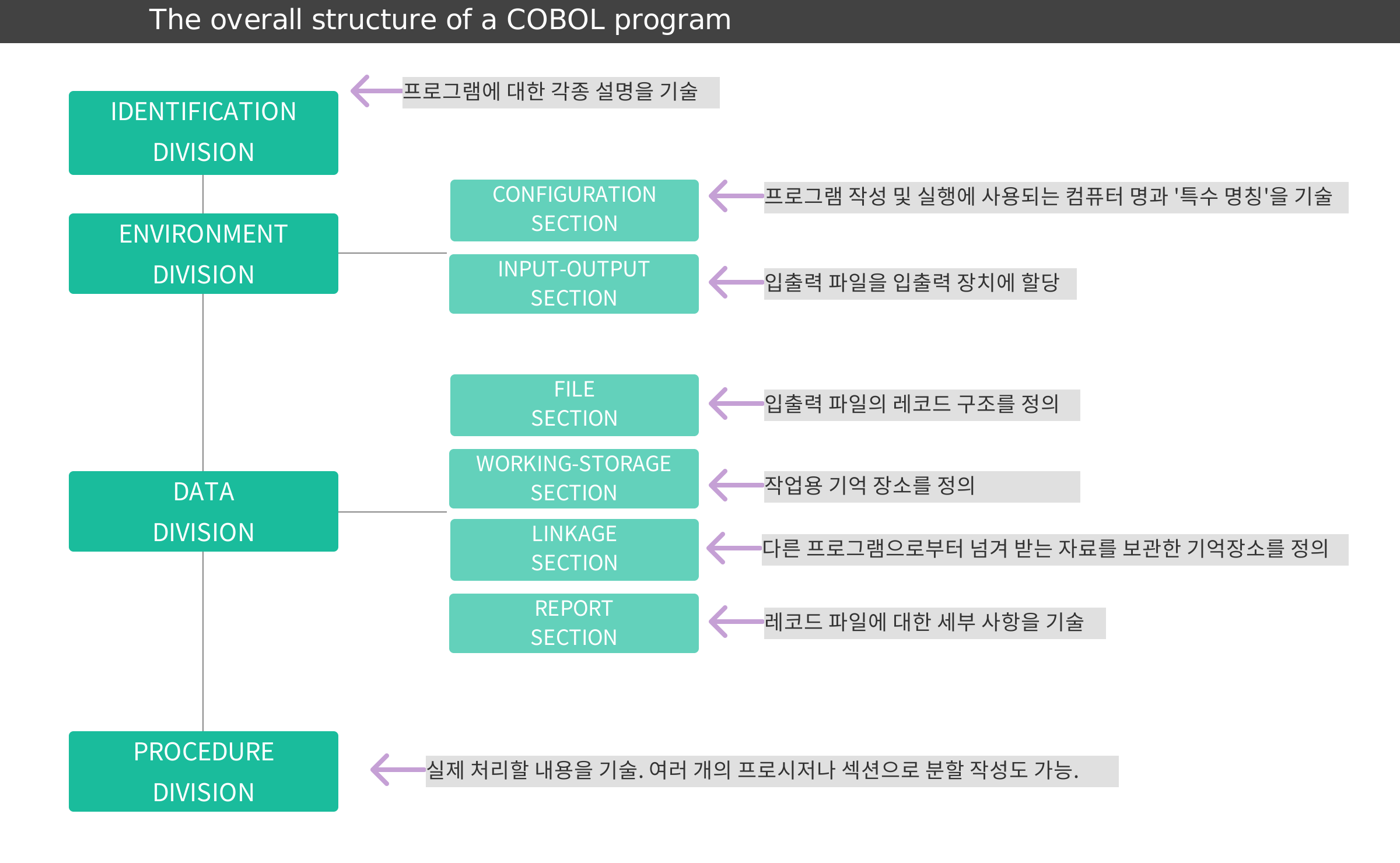 DIVISION은 D, I, V, ... , N의 문자들을 집합으로 되어 있다.DIVISION이 되는 것이다.GO TO KEUT-P 는 각각의 개별적인 단어가 모여서 하나의 명령문(Statement)Keut-P 프로시저로 이동시킴.PIC 9(5) VALUE 12345.PIC 9(5) : PIC 구VALUE 12345 : VALUE 구IF I = 0 GO TO KEUT-P ELSE GO TO GYESAN-P. : 하나의 전체 문장GO TO KEUT-P & GO TO GYESAN-P : 명령문. : 한 문장의 끝에는 반드시 .을 적어야 한다.SECURITY. CONFIDENTIAL. *> 하나의 문장