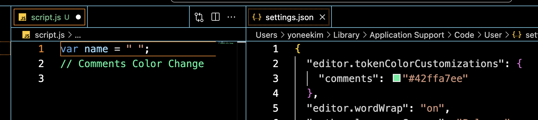 "editor.tokenColorCustomizations": { "comments": "#42ffa7ee" },