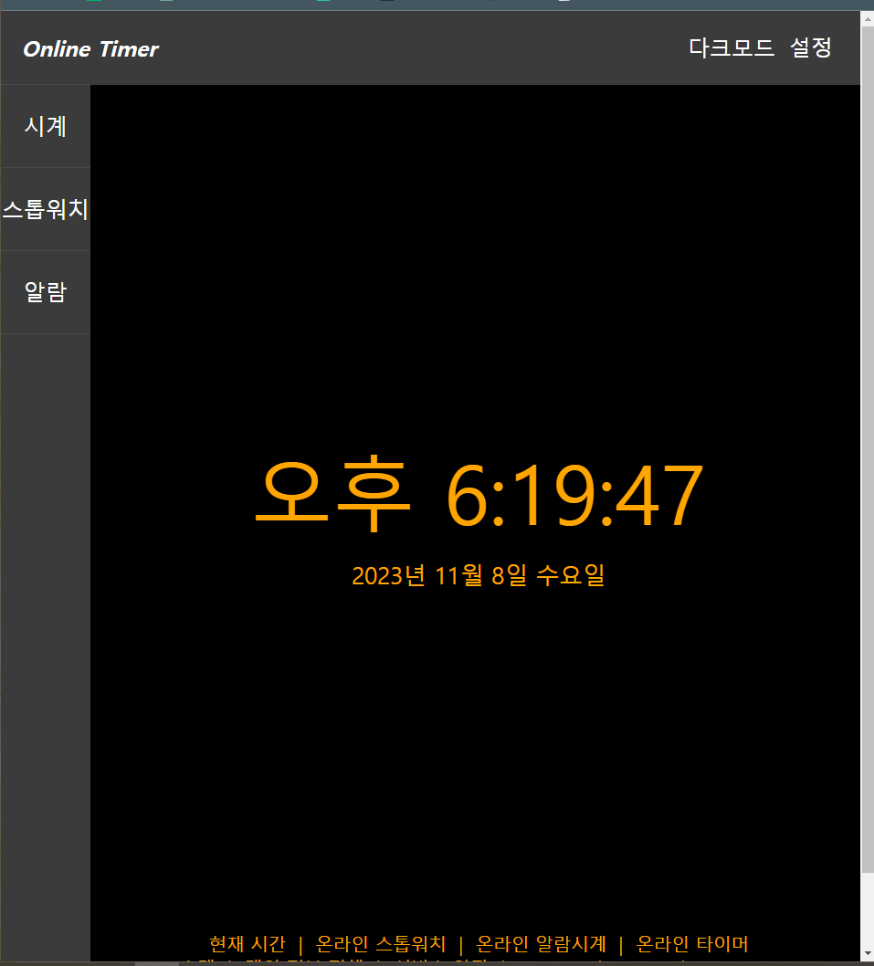 학과 과정 중간 점검 느낌으로 지금까지 배운 c, java, javascript 중 하나를 사용해 온라인 타이머 웹사이트를 만들어 보려고 한다. 기본적으로 메인화면에 현재 시간을 띄워놓고, 알람 기능과 스톱워치 기능 등 타이머 기능 등을 추가해 보려 한다. 기본적인 틀은 온라인 시계 사이트(https://vclock.kr/timer/)를 참고했다.
