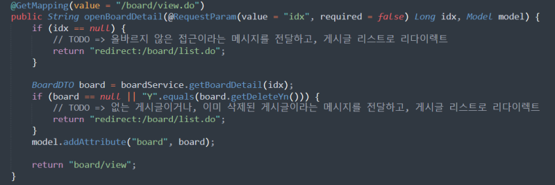 • if 문에서 idx가 파라미터로 전달되지 않으면 사용자에게 적절한 메시지를 전달하고, 게시글 리스트로 리다이렉트
