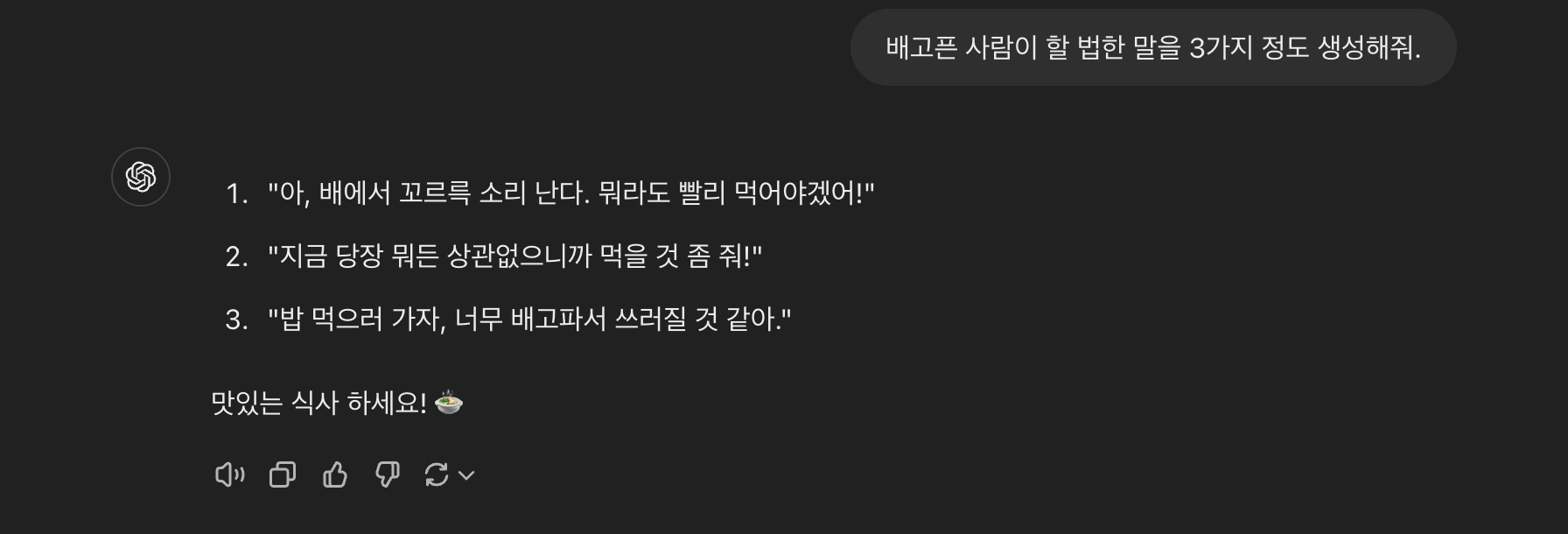 '배고픈 사람이 할 법한 말을 3가지 정도 생성해 줘.'