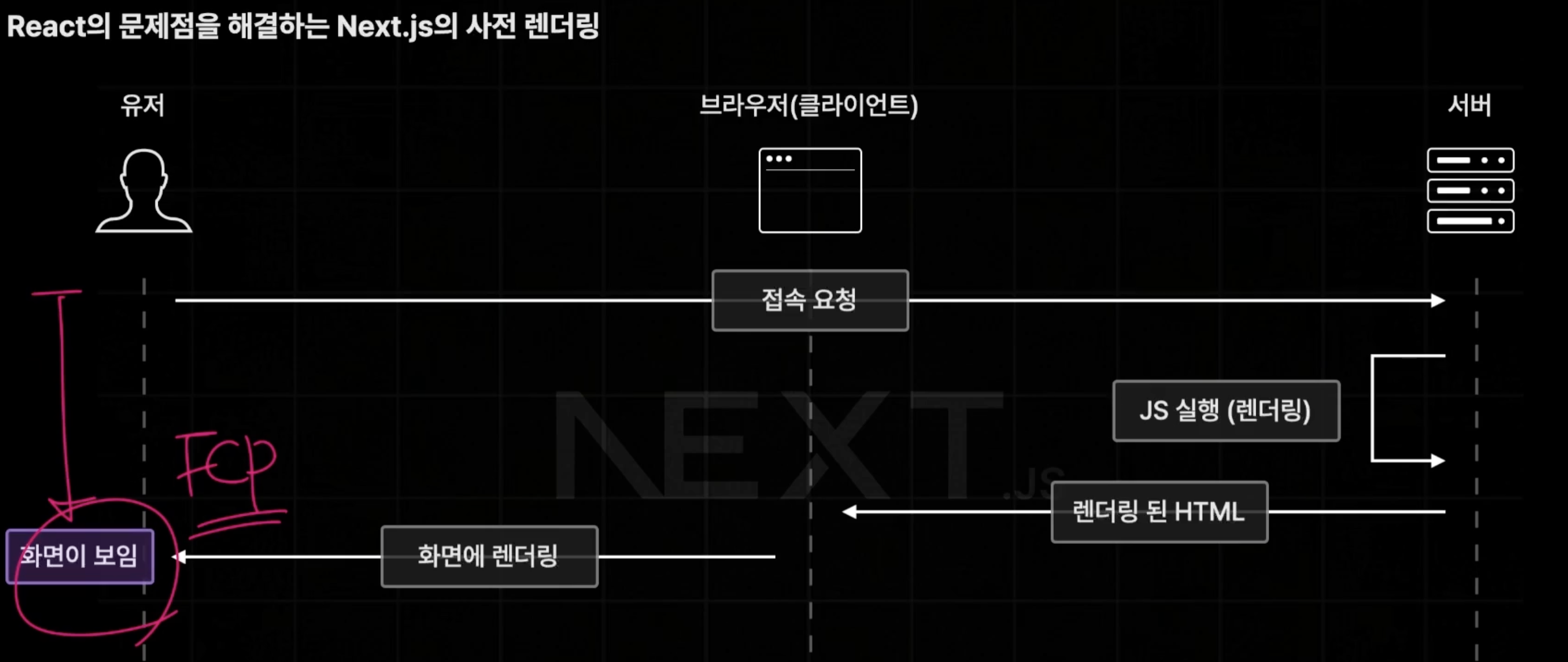 CSR의 FCP 문제를 해결하기 위해 Next.js에서 도입하였다