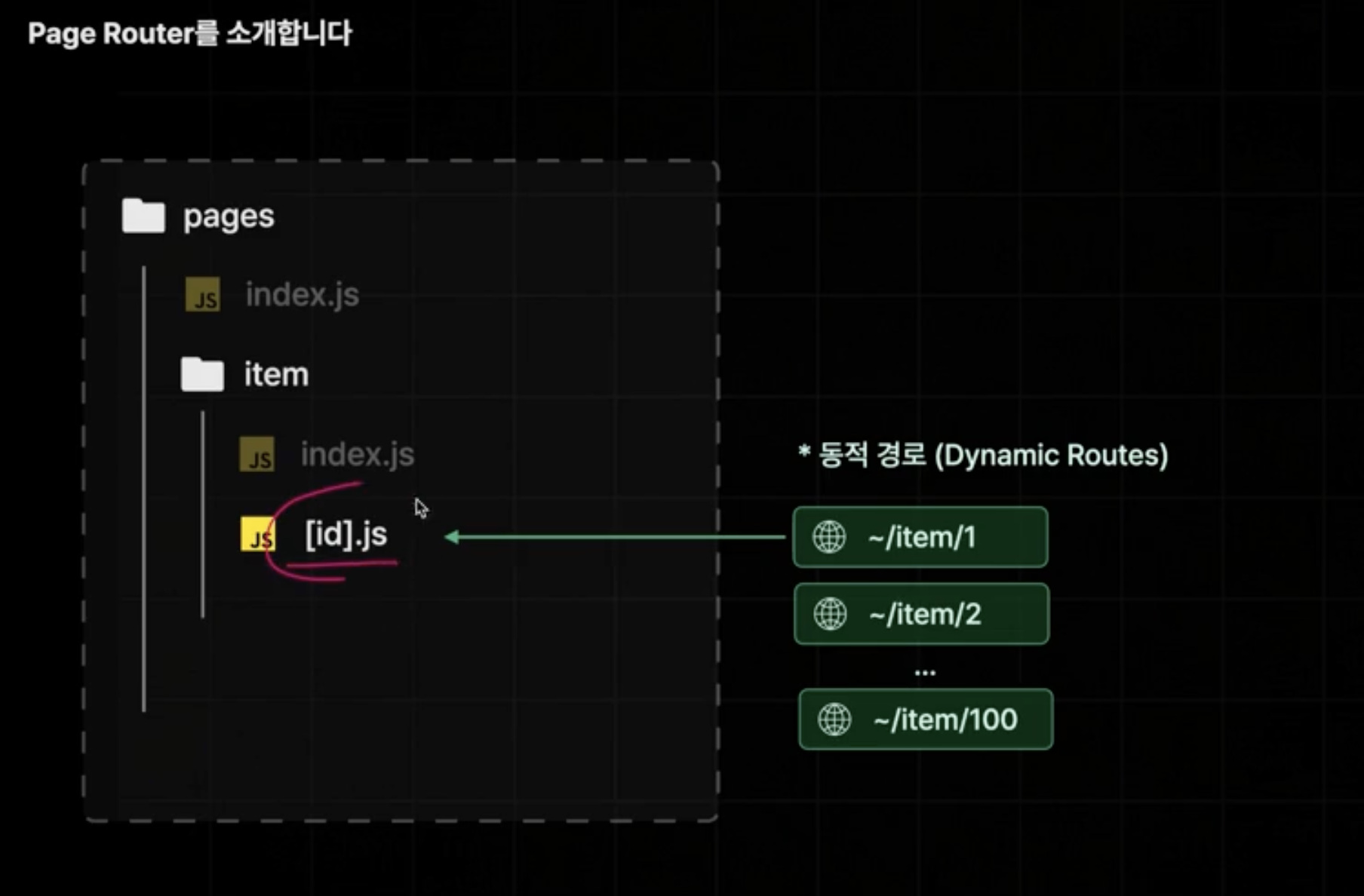 폴더 아래에 [id].js와 같이 선언하면 "item/1"처럼 동적으로 경로 설정이 가능하다