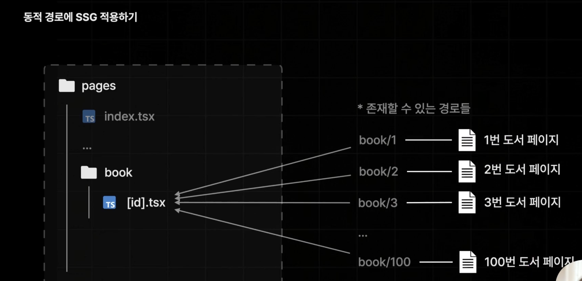 아래와 같은 동적경로에 SSG를 적용하려면 먼저 getStaticPaths를 통해 먼저 렌더링 될 경로를 설정하고 getStaticProps를 통해 선언한 경로를 사전렌더링을 진행한다.