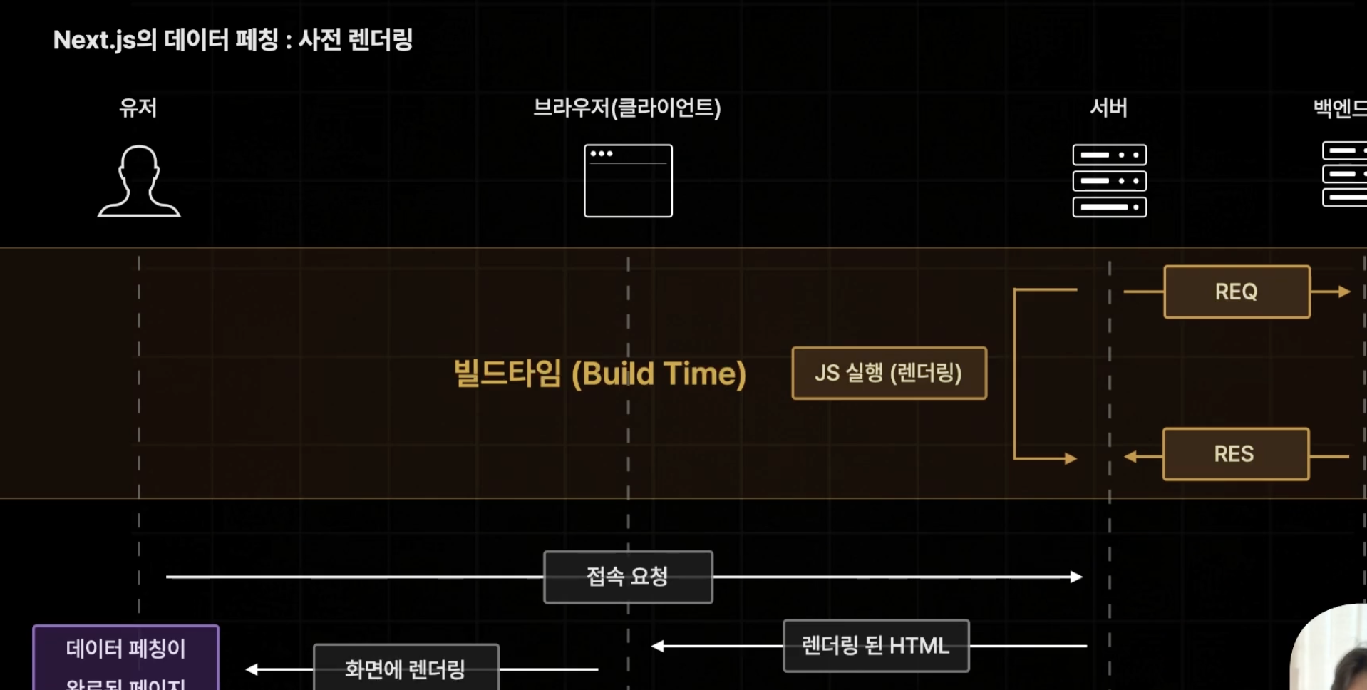 단점: 빌드 타임에 사전 렌더링을 하기 때문에 페이지 접속 요청을 해도 매번 똑같은 페이지만 응답해서 최신 데이터 반영은 어렵다.