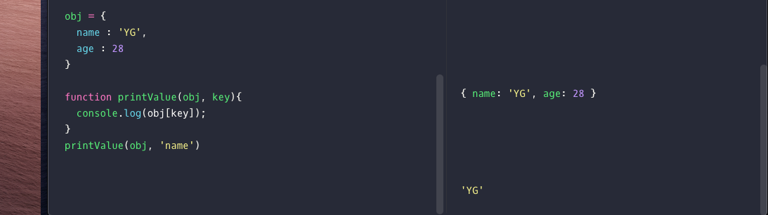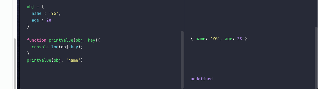 이러한 경우는 obj에 key라는 property를 호출하라는 것이다. 하지만 obj 내에 key라는 property값이 없으면 undifined를 받아오게된다. 이것을 방지하기 위해서는 obj.key가 아닌