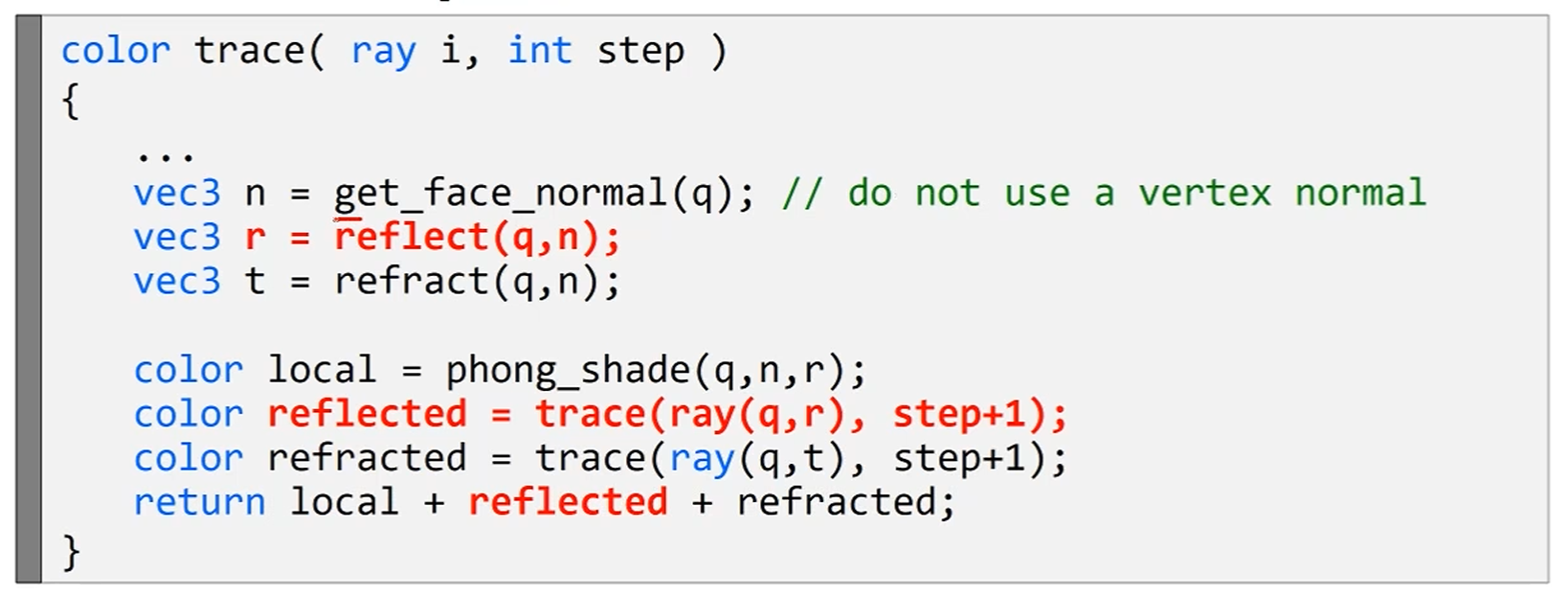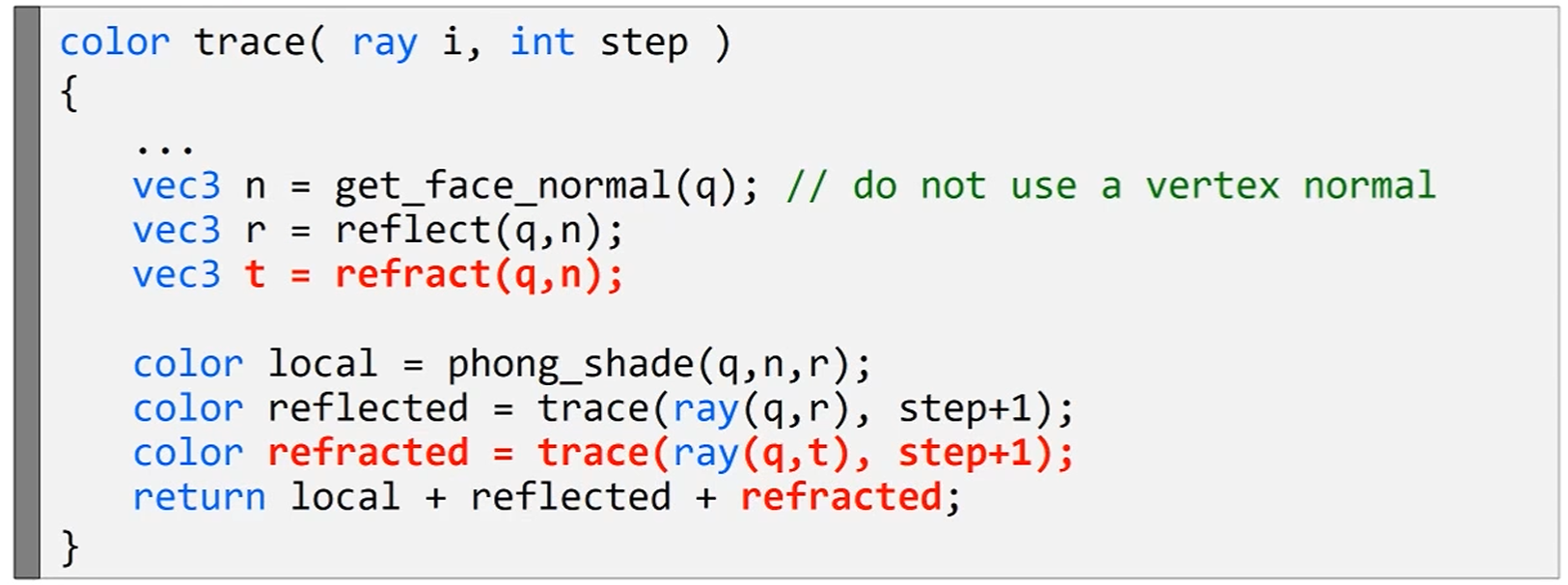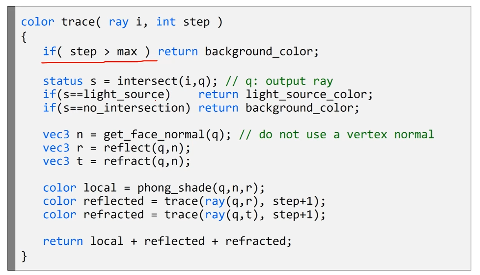 재귀적으로 전반사와 굴절을 고려하는 것을 의미합니다.
