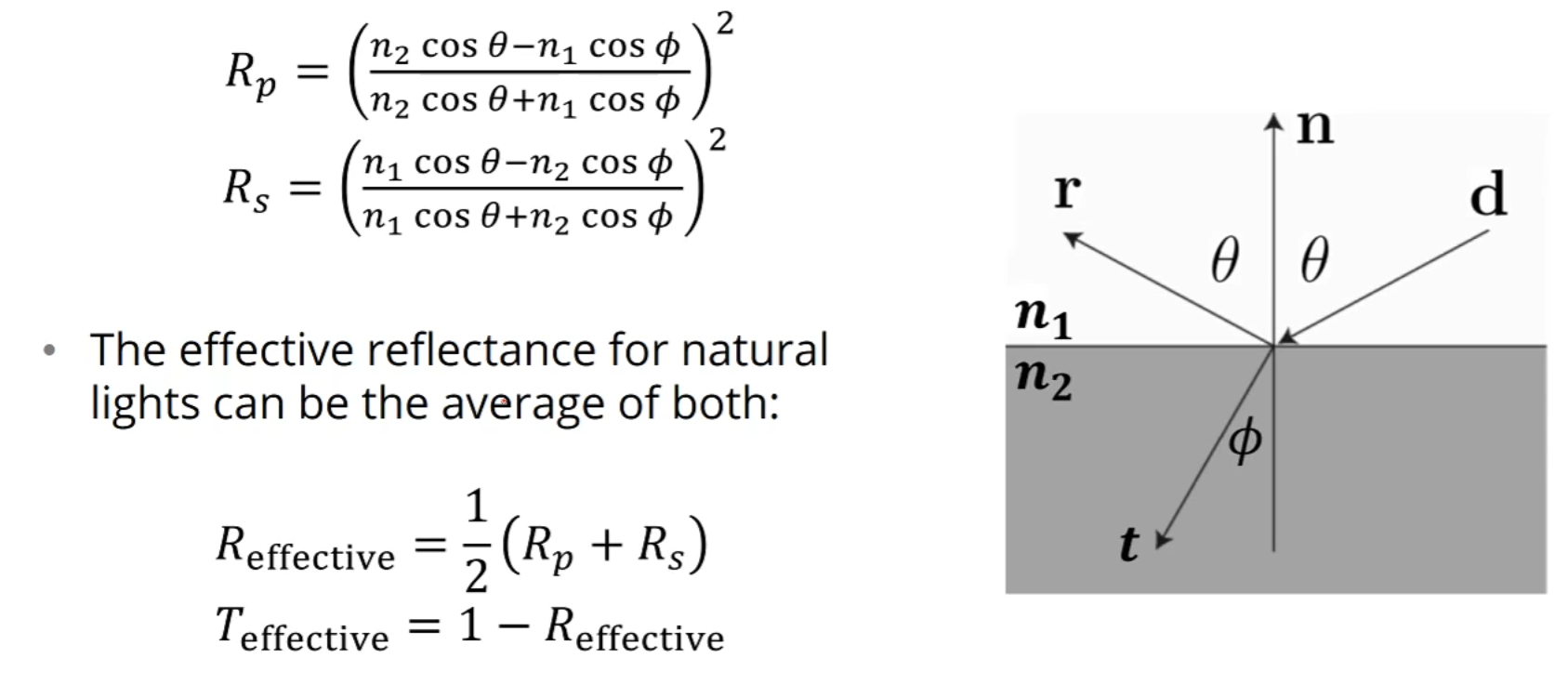 위의 Fresnel 반사식에서 norm과 평행하게 들어오는 빛의 경우는,