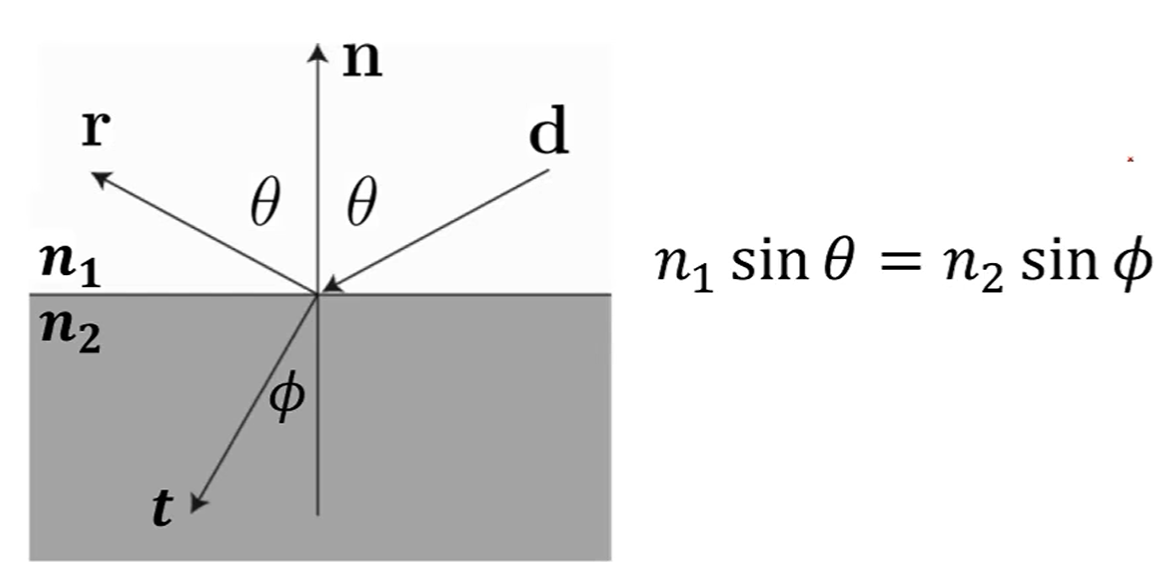 Reflection은 반사고, Refraction(transmission)은 굴절입니다.