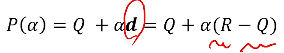 그리고, 를 으로 정의하면, Q에서 P로 쏘는 반직선, ray가 되구요