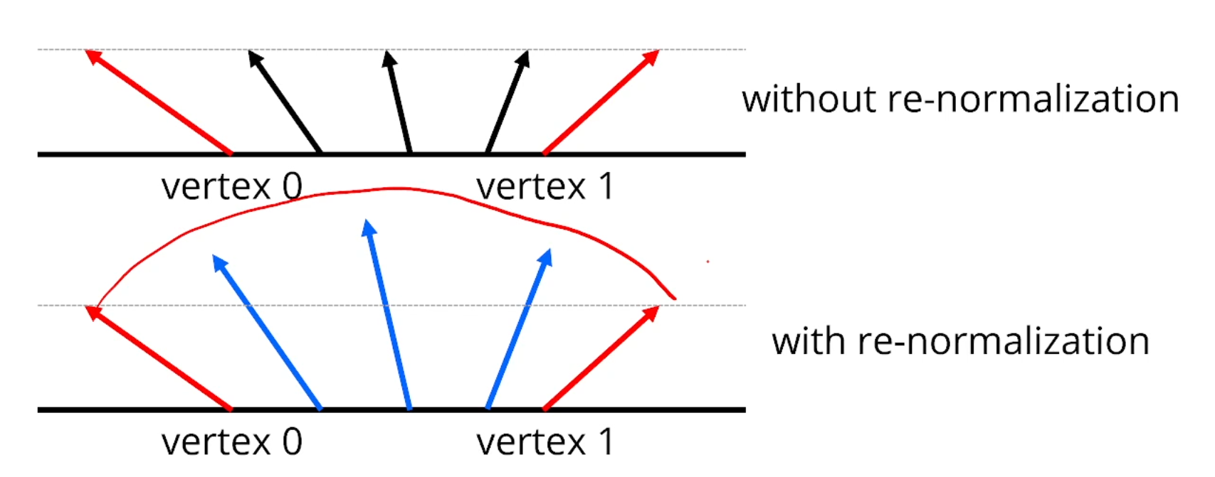 Per-fragment normal들은 rasterizer가 linear하게 interpolate 시켜놓습니다.