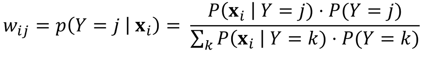 분자의 전체합으로 나누면 가 에 속할 확률이 계산이 됩니다.