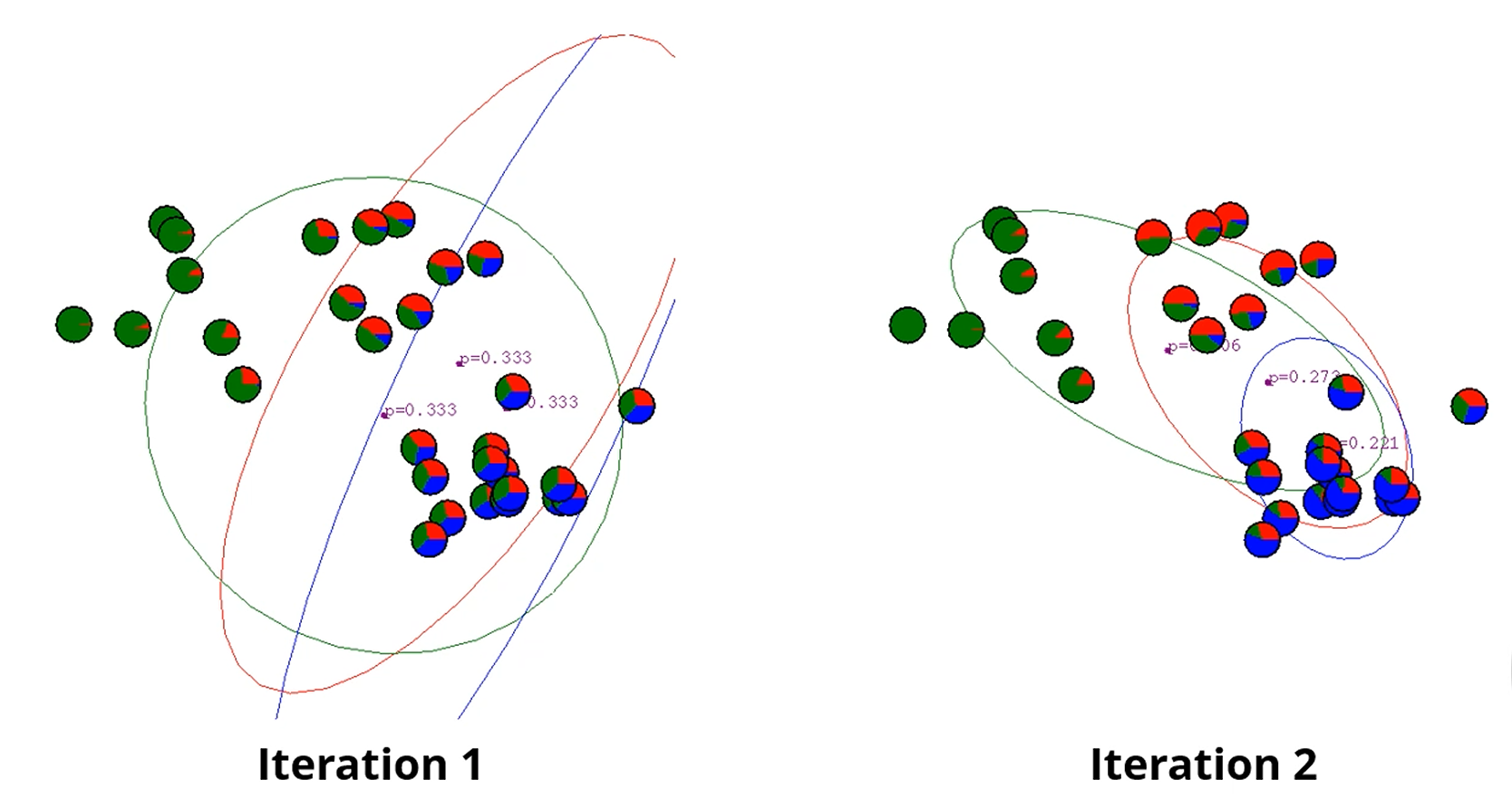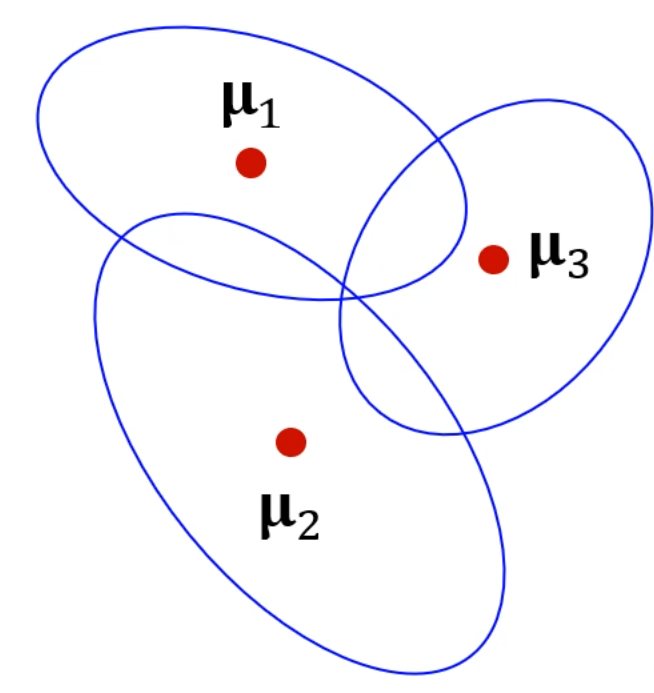 이런 점들에 대해서, 결국엔 3개의 Gaussian 분포의 중심과 공분산을 찾아야 하며,