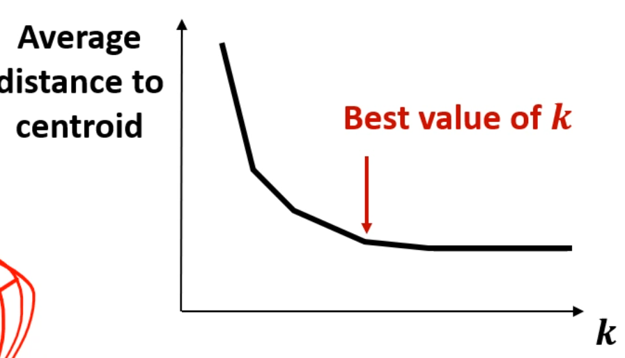 k를 점점 늘려가면서, 전체 점들의, 각자의 centroid로의 평균을 내서, 그 값을 잽니다.
