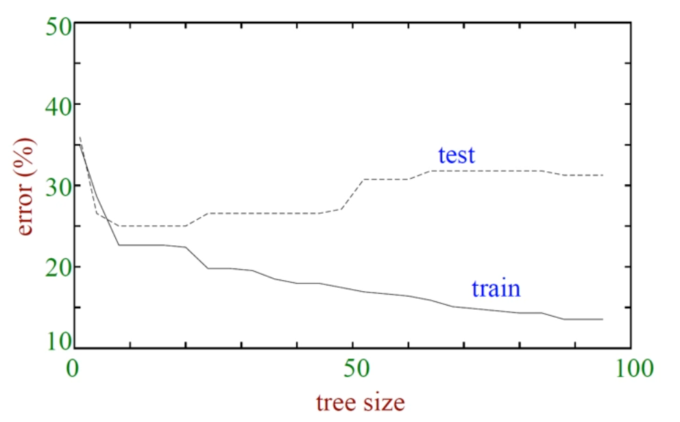 Tree size가 너무 커지면 trianing data는 잘 분류하지만 test data에서 error가 너무 늘어나네요.