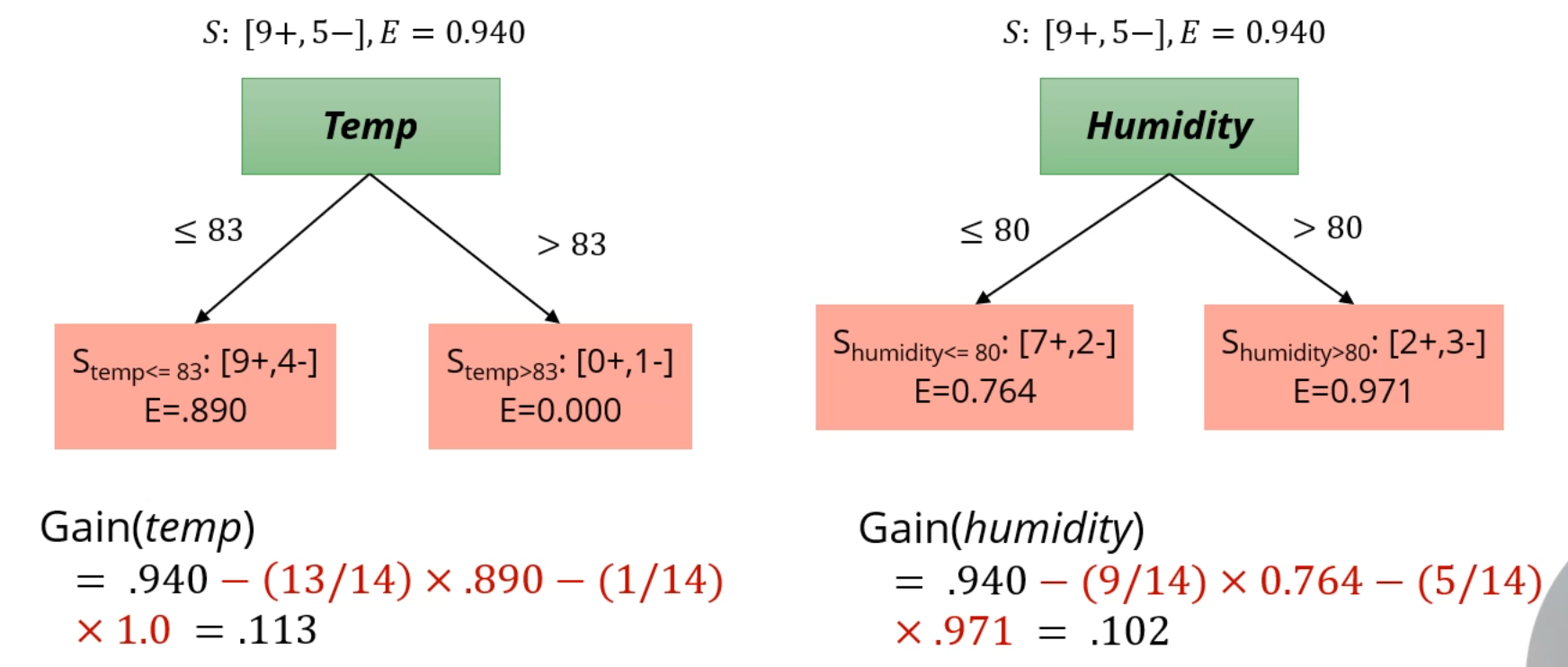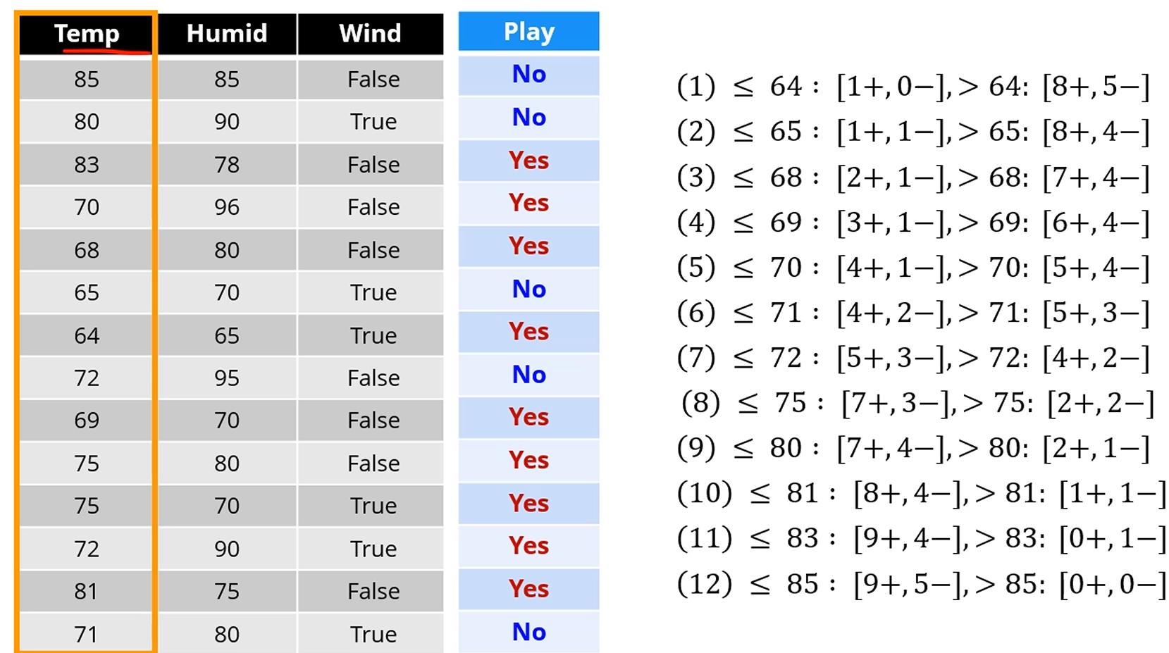 그러면 Temperature <= 83? 을 Attribute로 삼아서 분리를 합니다.