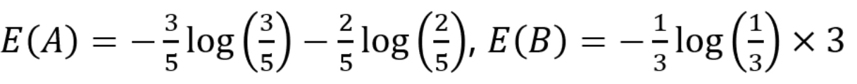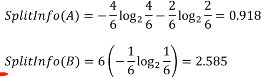 이를 이용해 SplitInfo(A), SplitInfo(B)를 계산합니다. (쪼개진 결과는 여기선 관련이 없습니다)