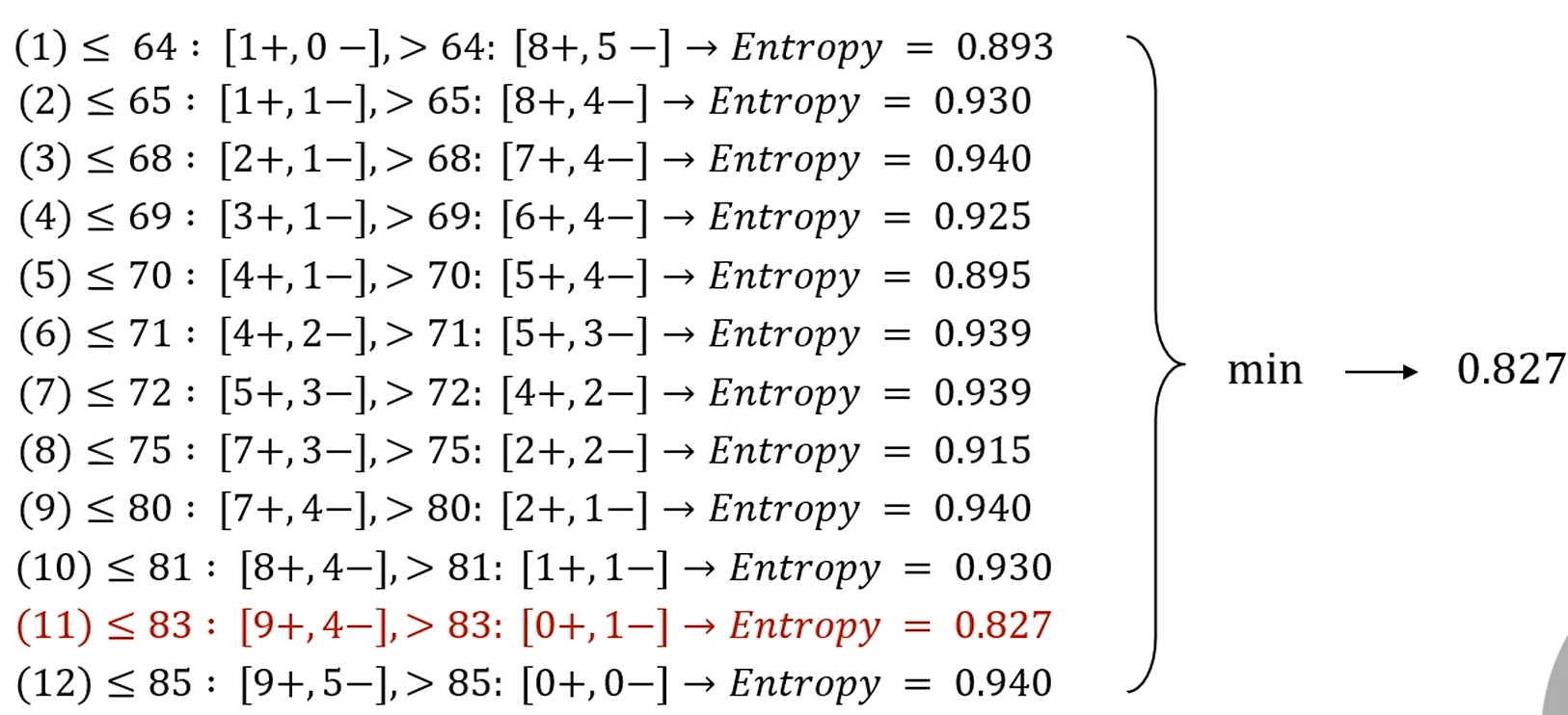 모든 값에 대해 엔트로피를 다 생성합니다. 그러면 최소값이 나옵니다.