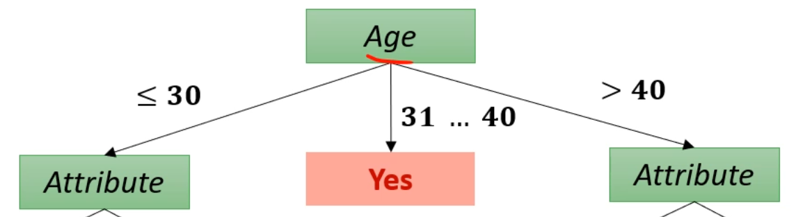 이제는 Age에 가능한 값이 <=30, 31~40, >40이 있으니 branch가 3개가 됩니다.