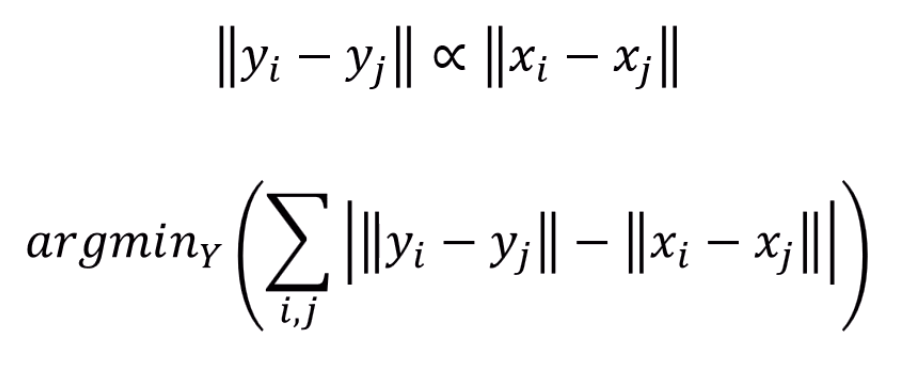 즉 두 점들의 거리관계의 오차가 최소가 되는 의 집합 를 찾고자 합니다.