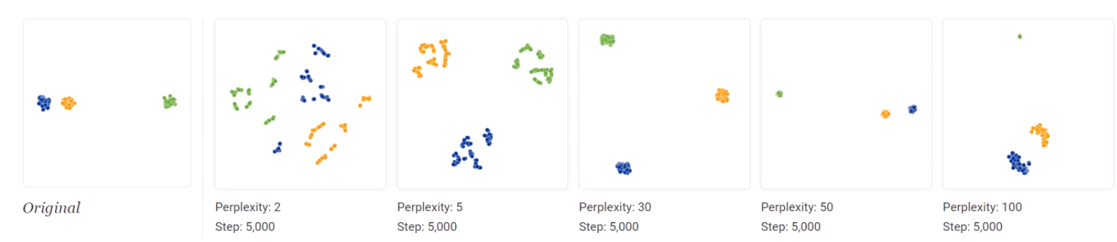 t-SNE에서 perp ()를 어떻게 잡냐에 따라서 데이터의 분포가 달라집니다.