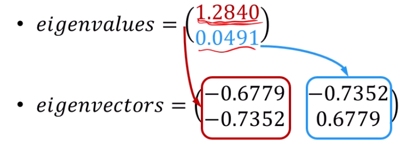 1.2840을 eigenvalue로 갖는 vector 가 PCA1축이고, 0.0491를 eigenvalue로 삼는 그 옆의 vector가 PCA2축입니다.