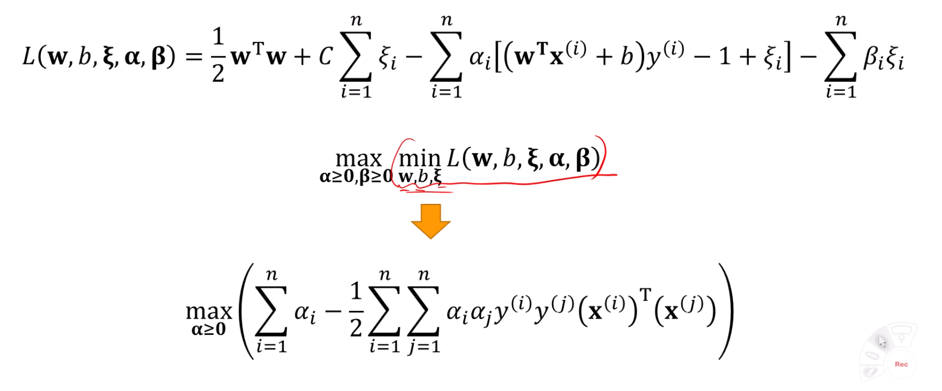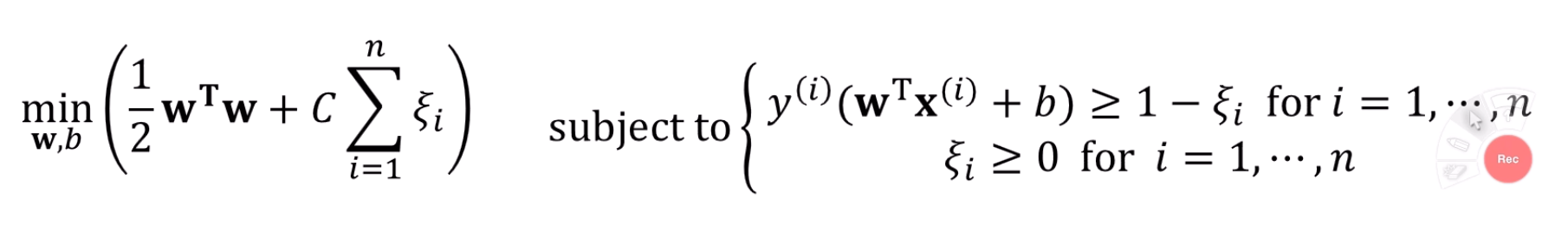 least margin은 최대화 하고, 합을 최소화 하는 것은 다음과 같이 표현됩니다.