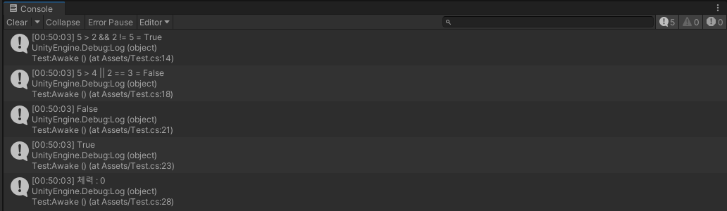 Debug.Log($"{x} > 2 && {y} != 5 = {result}");